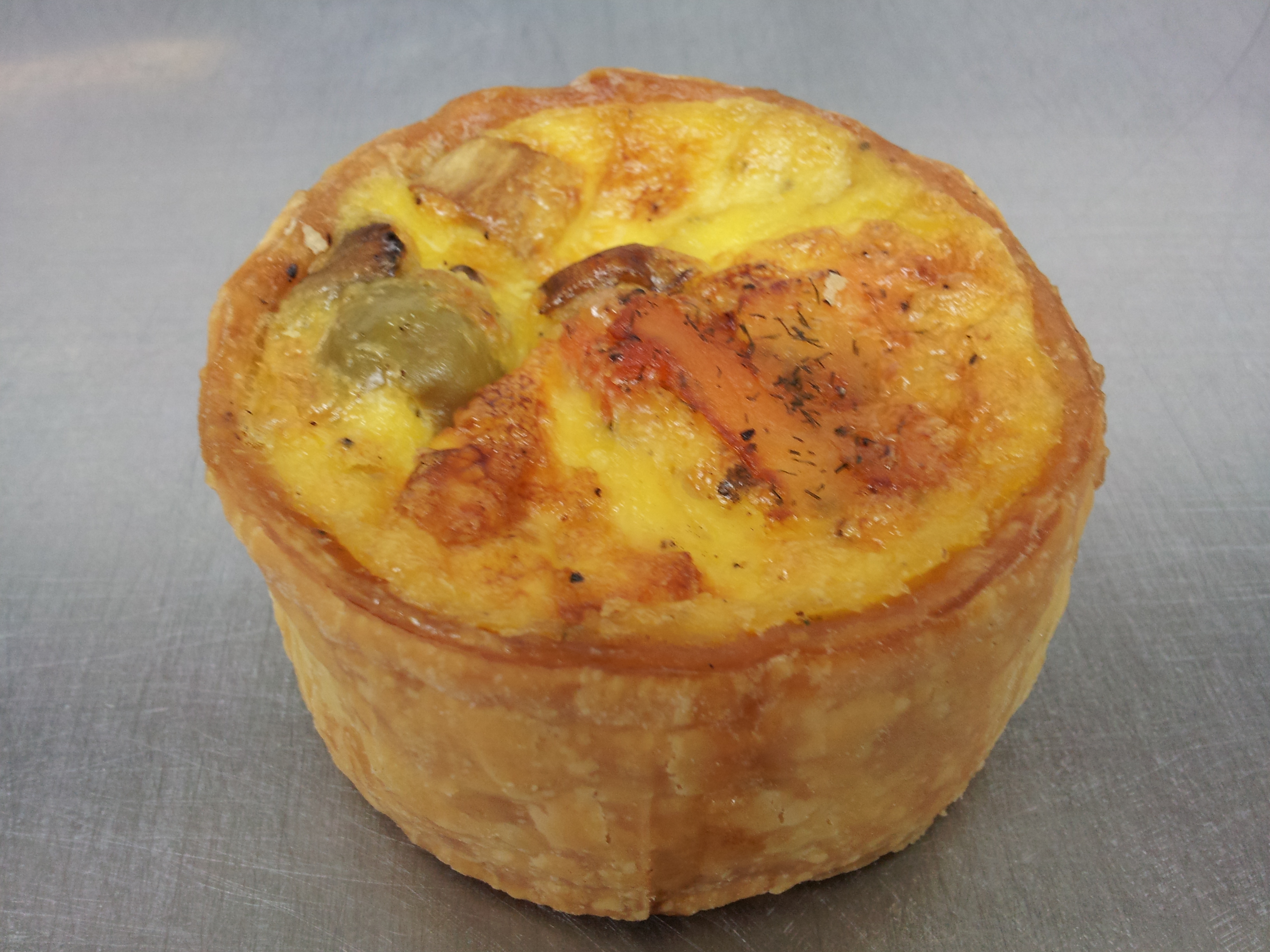 しめじ、えりんぎ、まいたけ、の3種類のキノコに、ニュージーランド産のスモークサーモンとグリーンオリーブを入れたキッシュです。400円です。