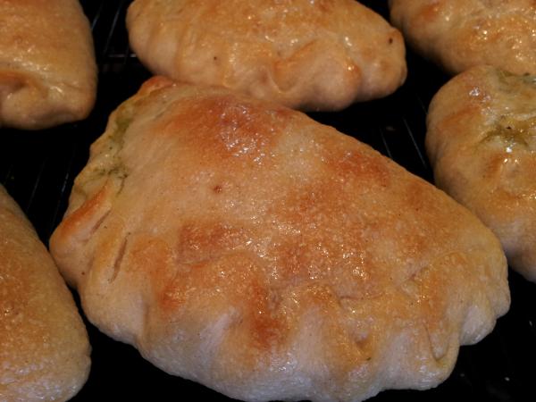 新商品、カルツォーネです。塩味の生地の中に、チキン、ジャガイモ、バジルソース、ホワイトソースが入っています。260円です。